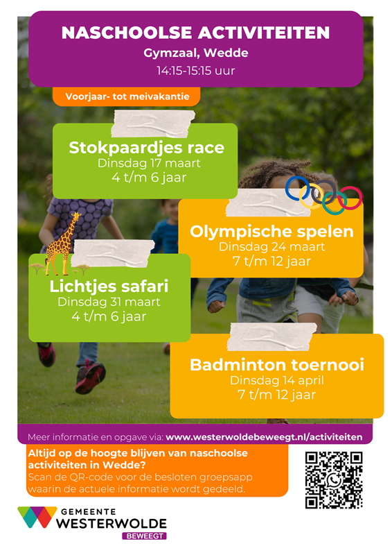 De nieuwe periode van het schooljaar is gestart. Samen met sportverenigingen en ons beweegteam hebben wij weer een leuk programma gemaakt. Meld je via deze website aan voor de activiteiten. Klik op het kopje 'activiteiten' bovenin. Zoek de activiteit waarvoor je je wilt aanmelden en vergeet vervolgens niet om de aanmelding te versturen! Dan zien we je daar.
